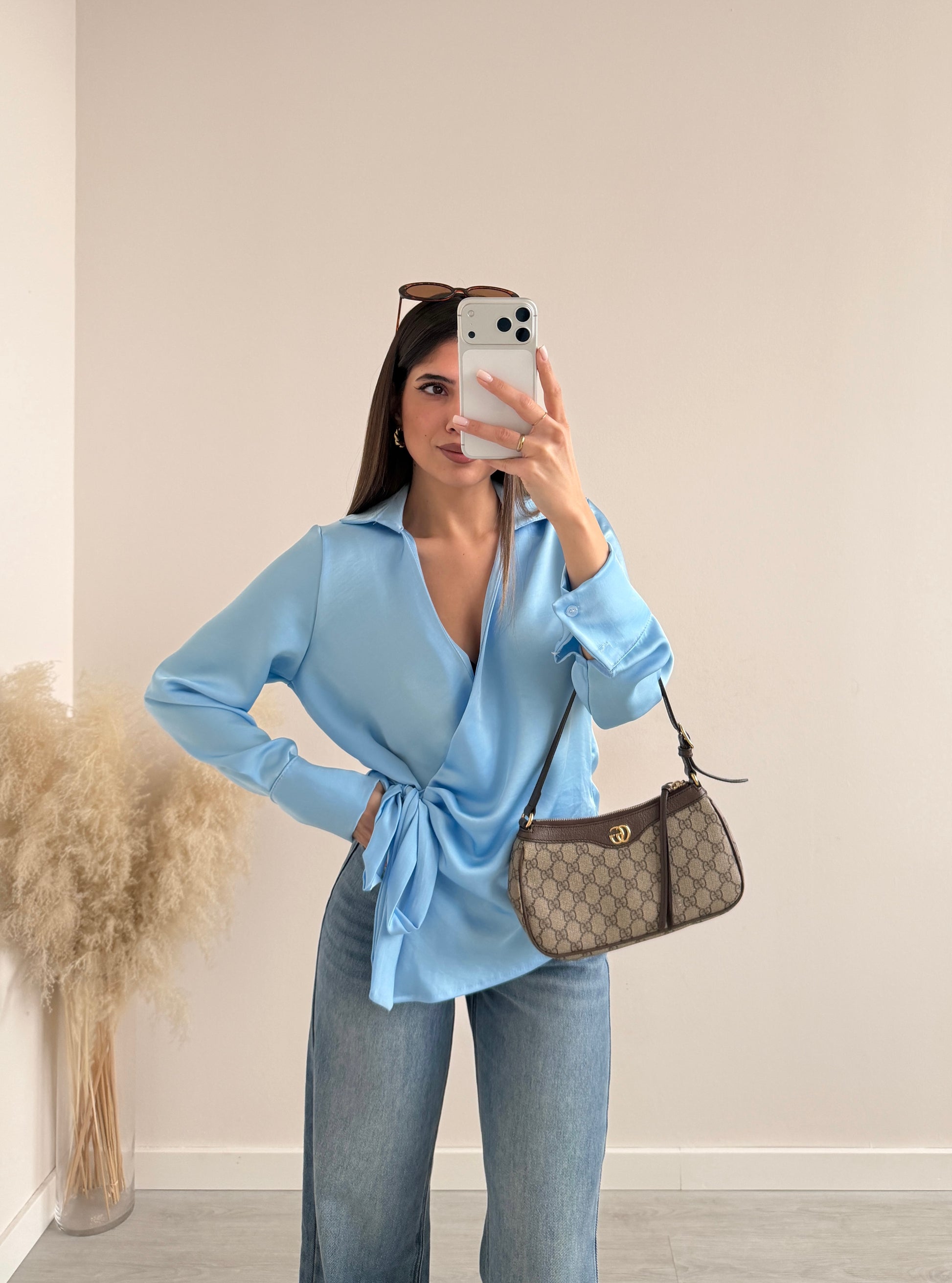 Blusa con nodo e scollo a V celeste