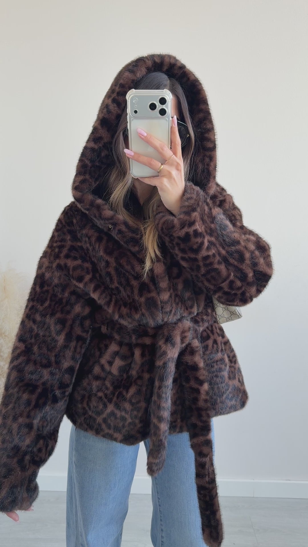 Ecopelliccia animalier con cintura e bottoni