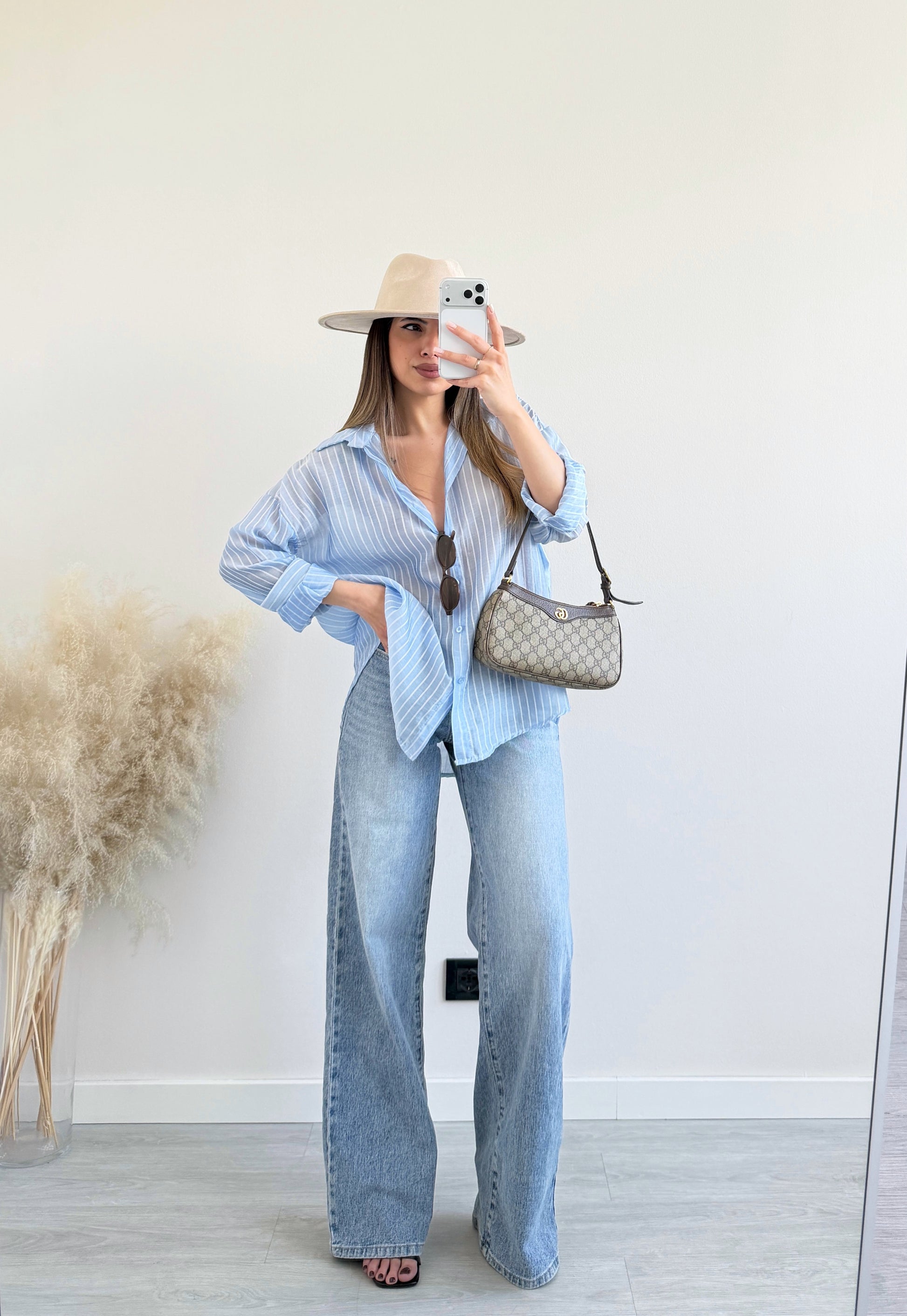 Camicia over velata a righe celeste