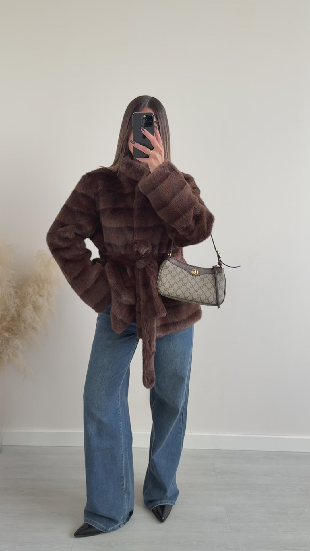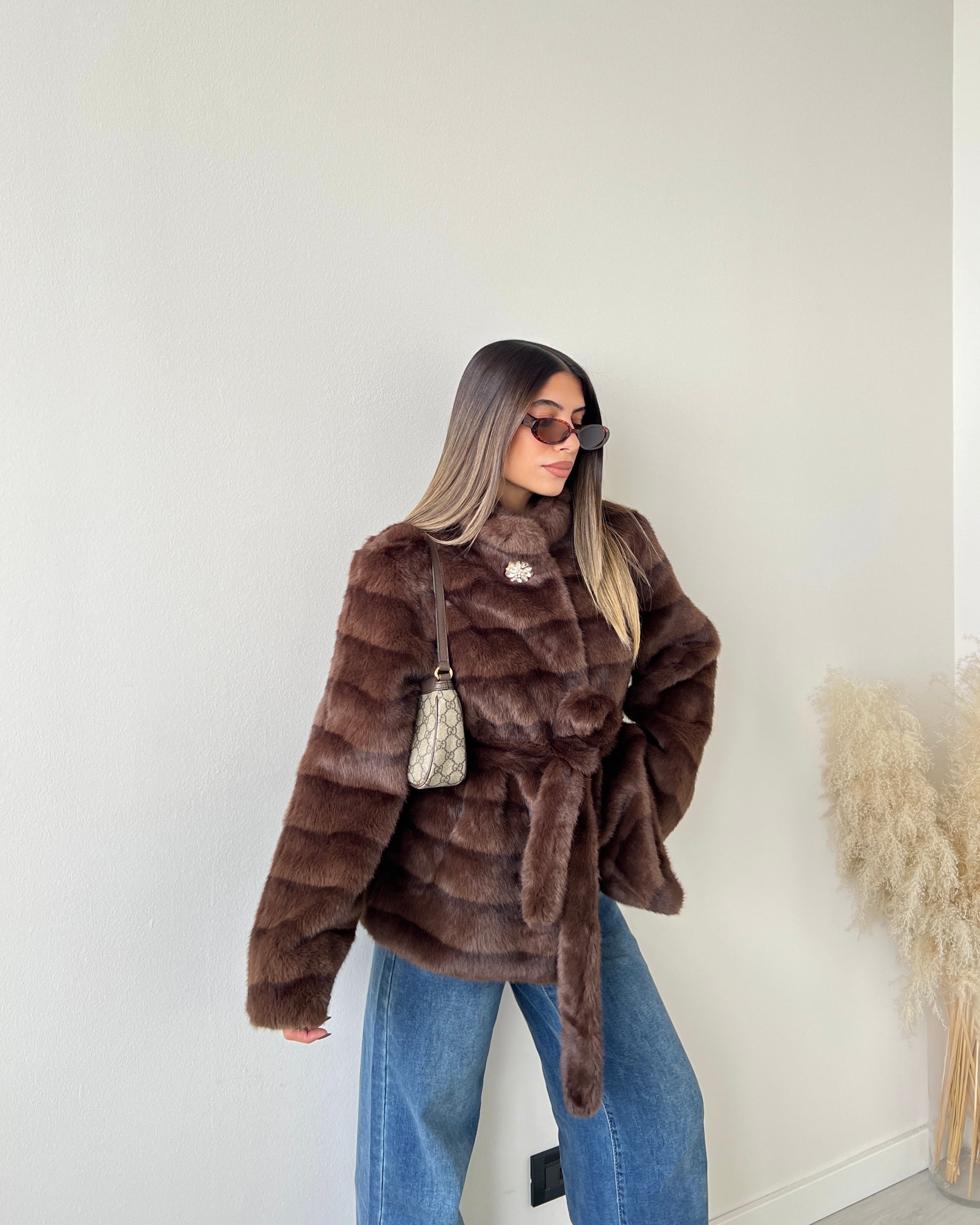 Ecopelliccia a collo alto con gioiello con cintura e tasche caffè