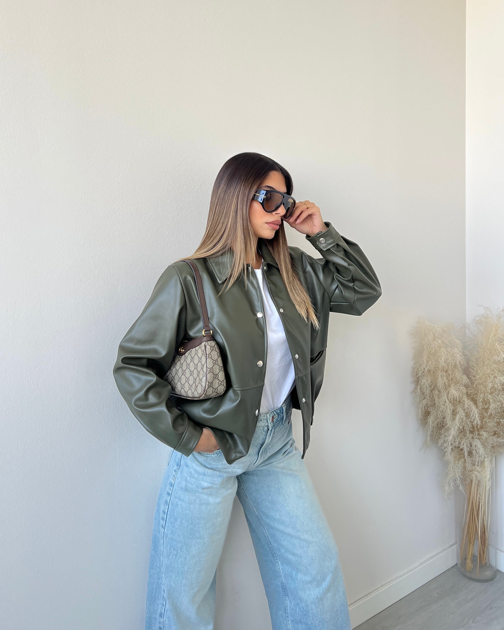 Giubbino in simil pelle con bottoni e tasche verdone