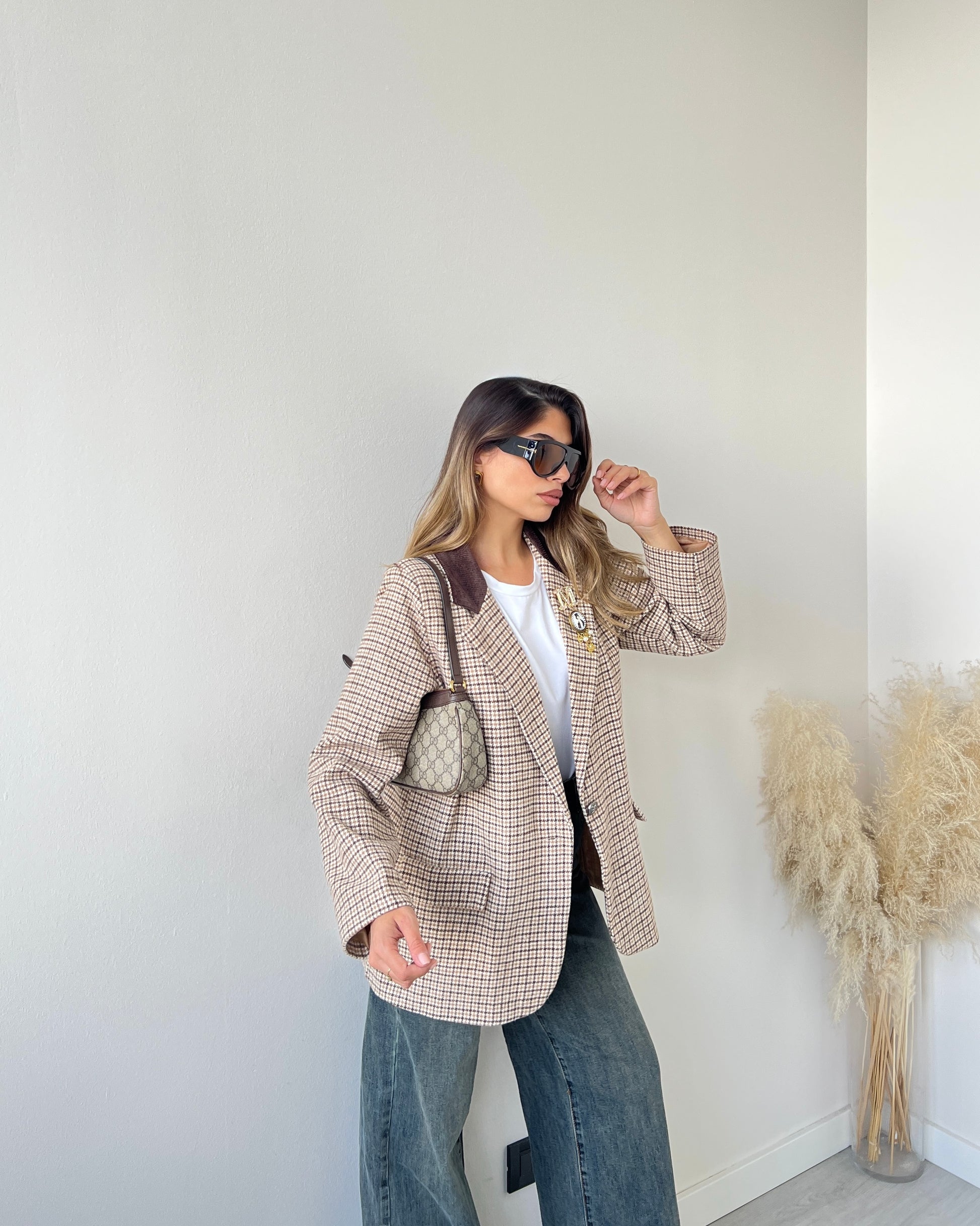 Giacca pesante pied de pooule con colletto in velluto e spille marrone