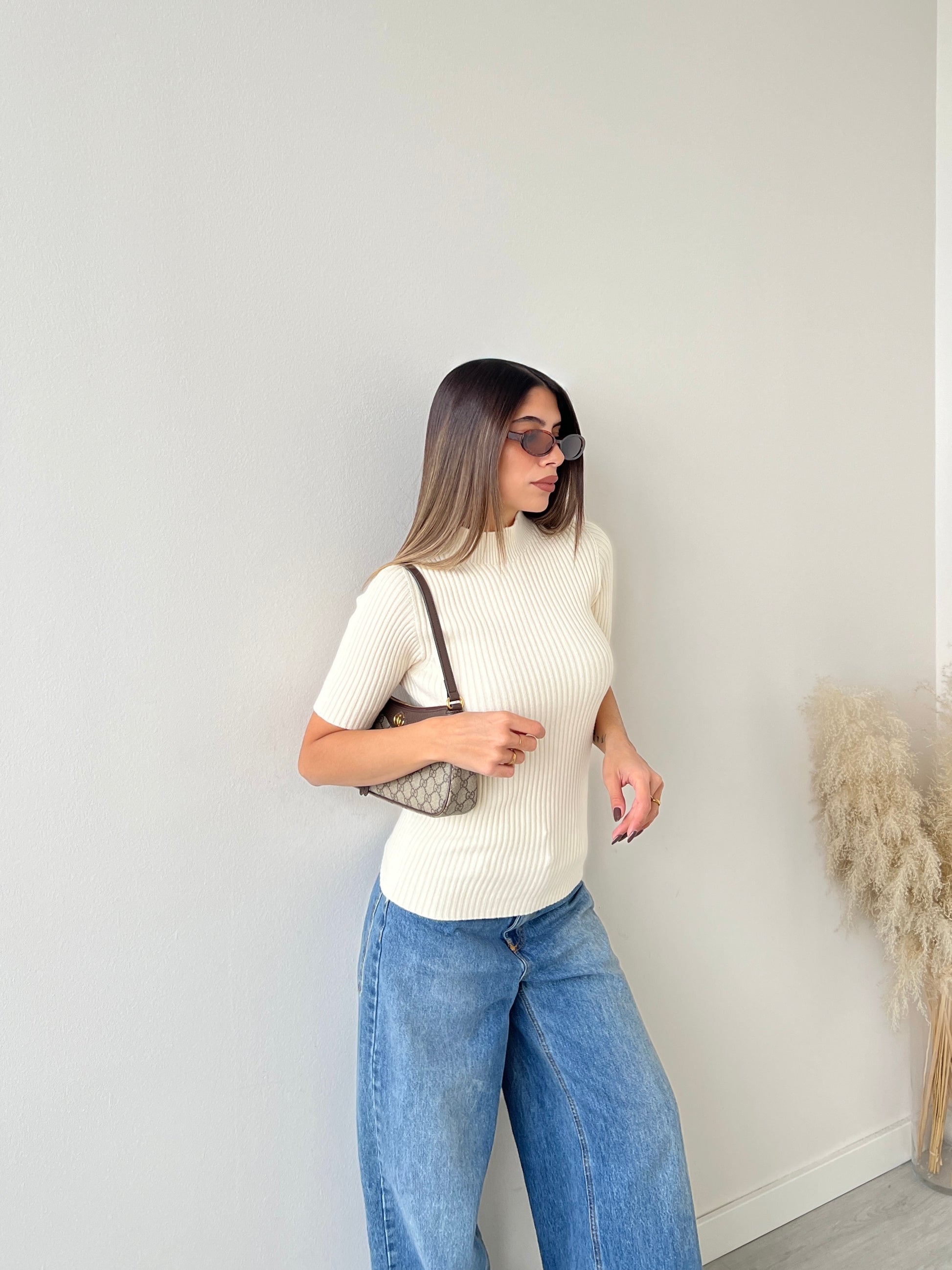 Maglia a collo alto a coste manica corta crema
