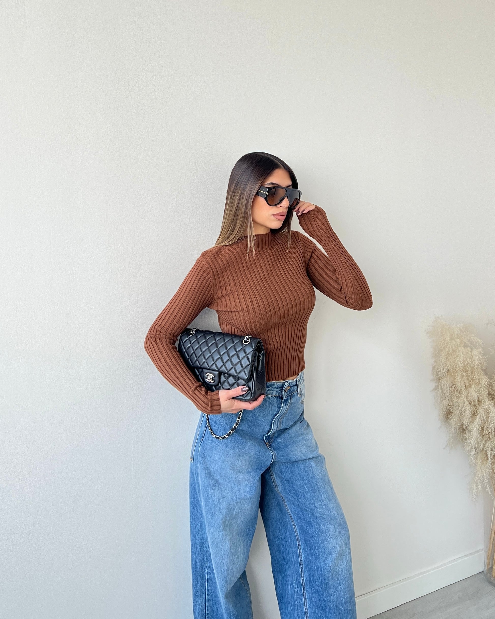 Maglia accollata a costine cacao
