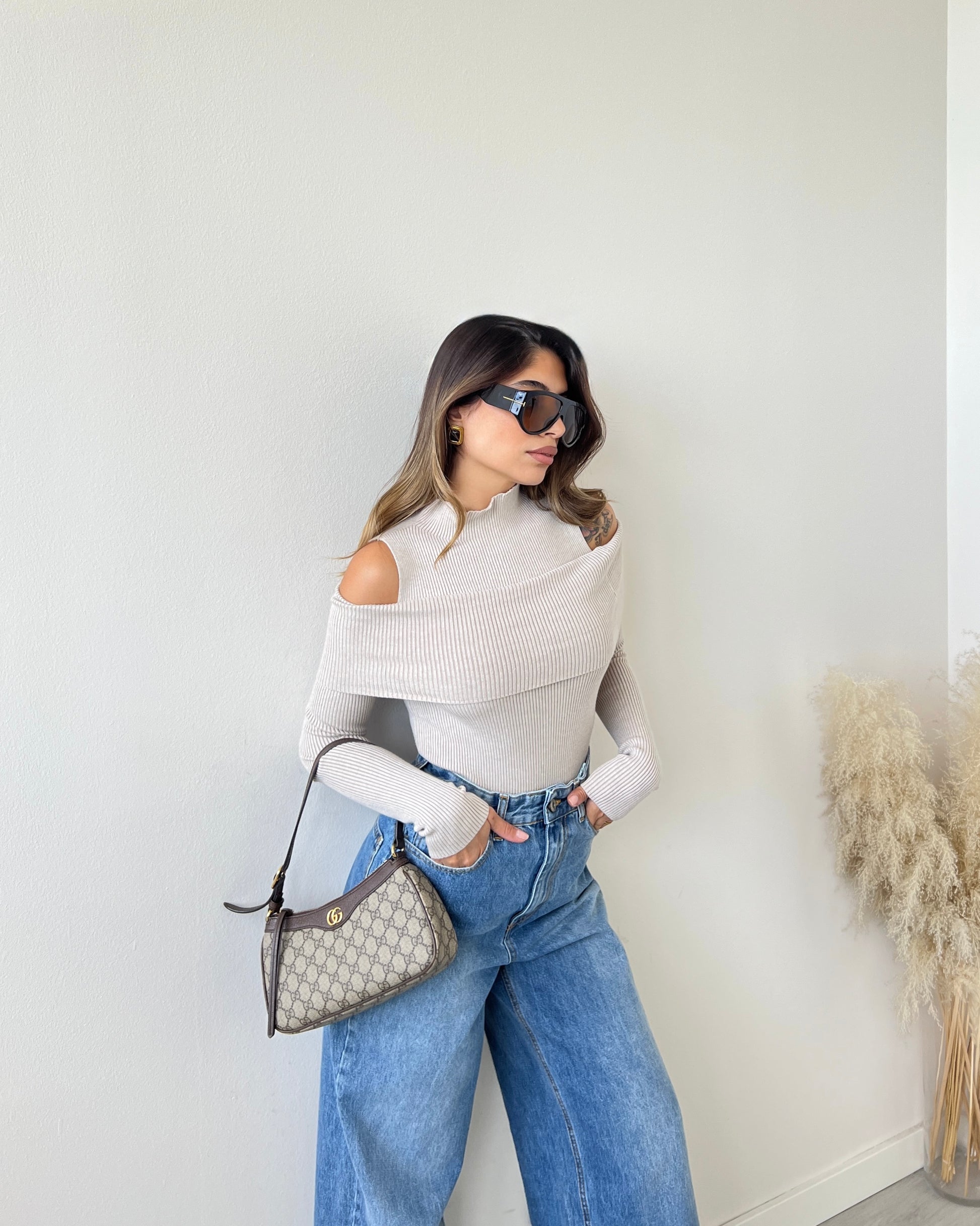 Maglia risvolto accollata sabbia