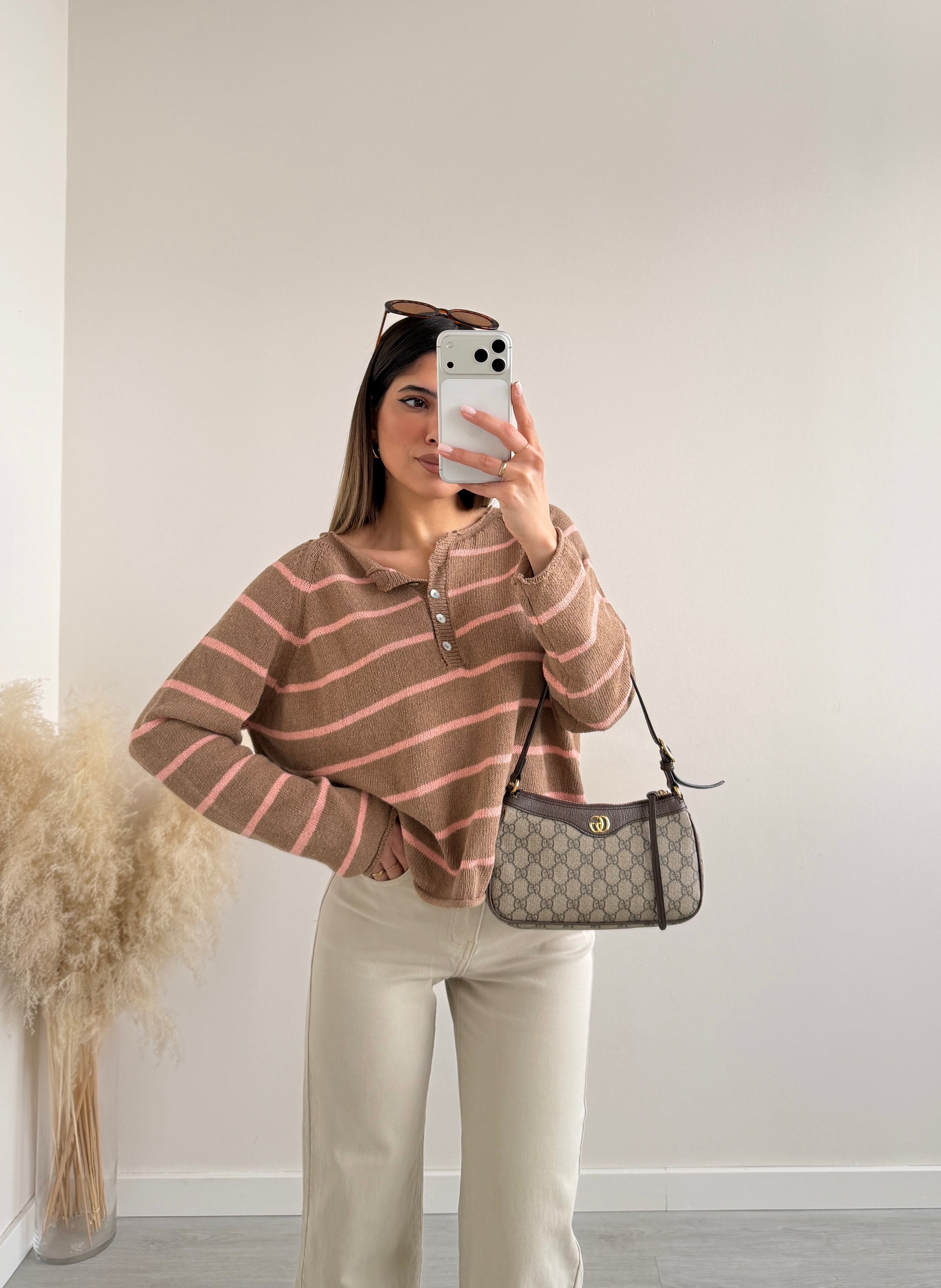 Maglioncino a righe con bottoni camel e rosa
