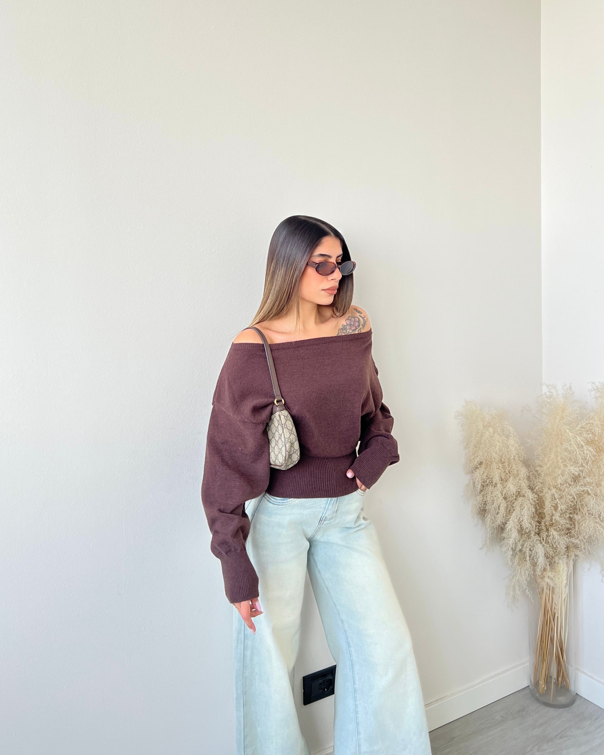 Maglioncino con scollo dritto e fascia in vita caffè